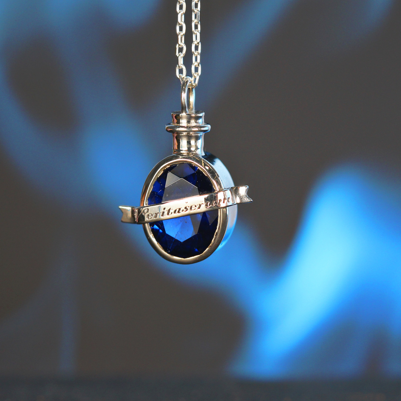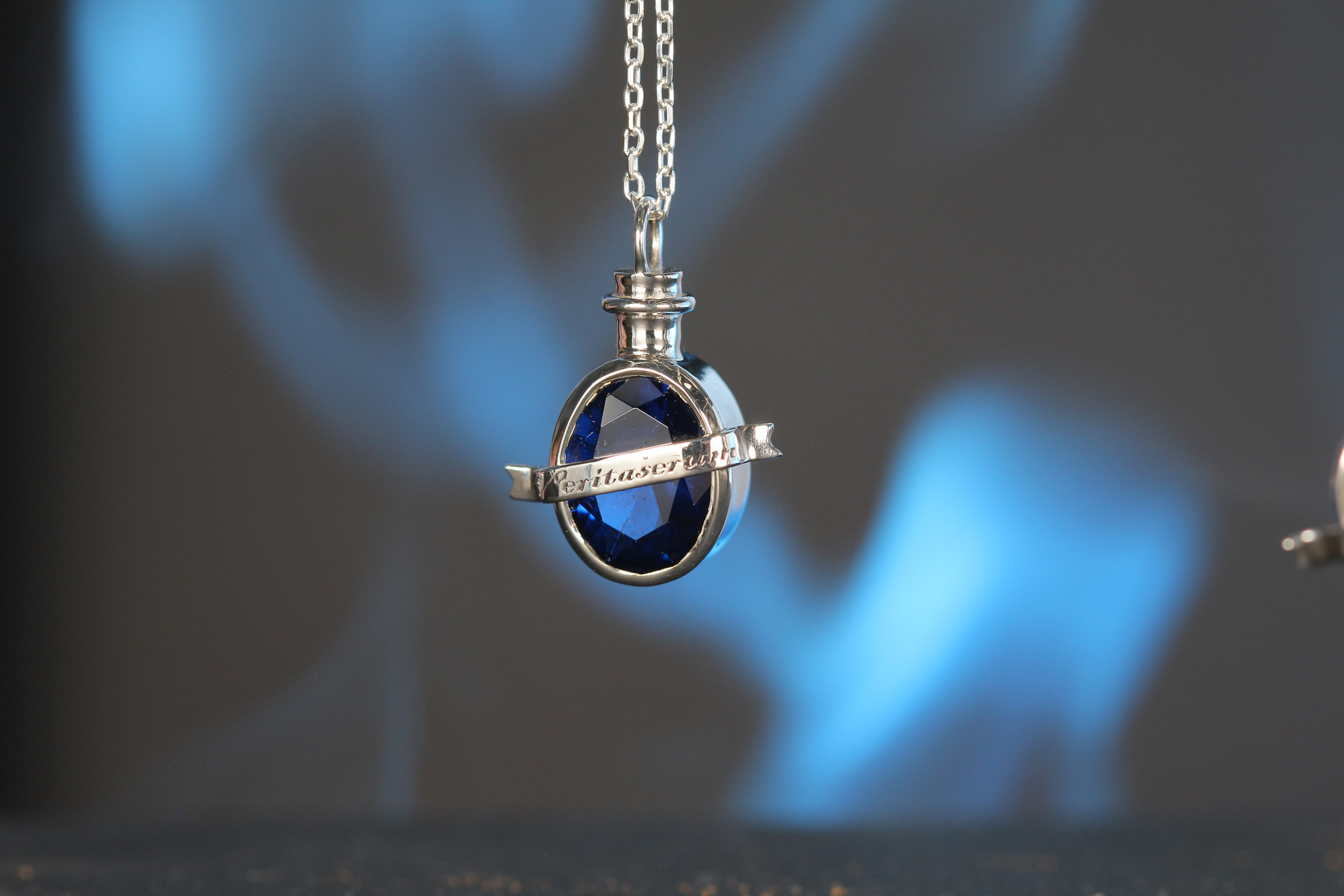 Colgante en forma de poción de la verdad. Unas gotas bastan para que quien lo ingiera declare toda la verdad. Hecha a mano en plata de ley, la piedra interior es una circonita azul en talla oval de aproximadamente 1 cm. de ancho. La poción mide algo más de 1 cm. y la cadena, también de plata de ley, está disponible en dos medidas: 40 y 50 cm.
